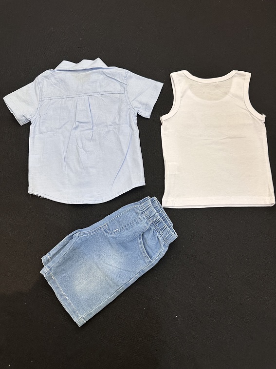 This 3-piece toddler set includes a light blue shirt, printed tank top, and denim shorts—perfect for warm days, playtime, or outings. Comfortable, stylish, and fun for ages 1–5.