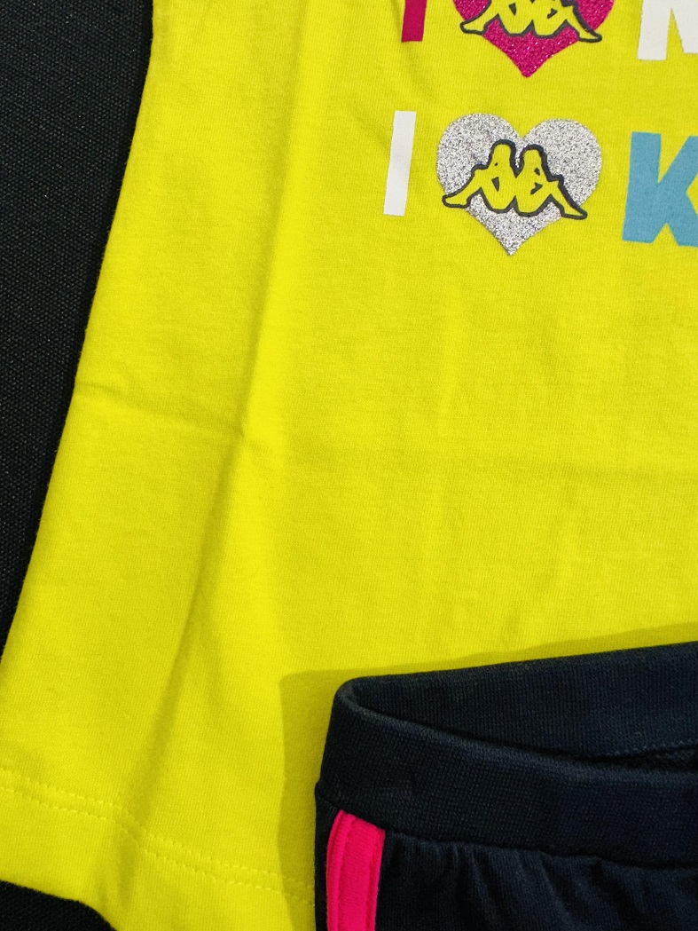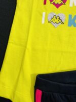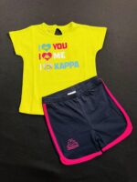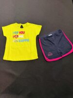 This vibrant 2-piece set features a yellow heart-print tee and navy shorts with pink trim, made from breathable cotton—perfect for summer play and everyday comfort.