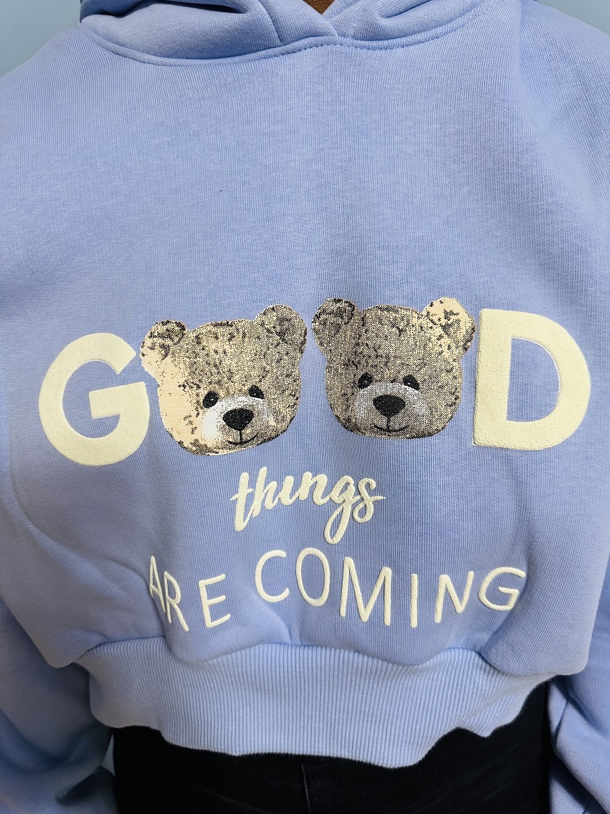 Blue “Good Things Are Coming” Teddy Bear Hoodie – Soft Cozy Pullover with Cute Design, Casual Positive Vibes Wear