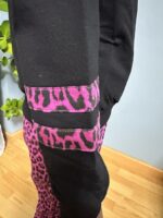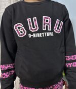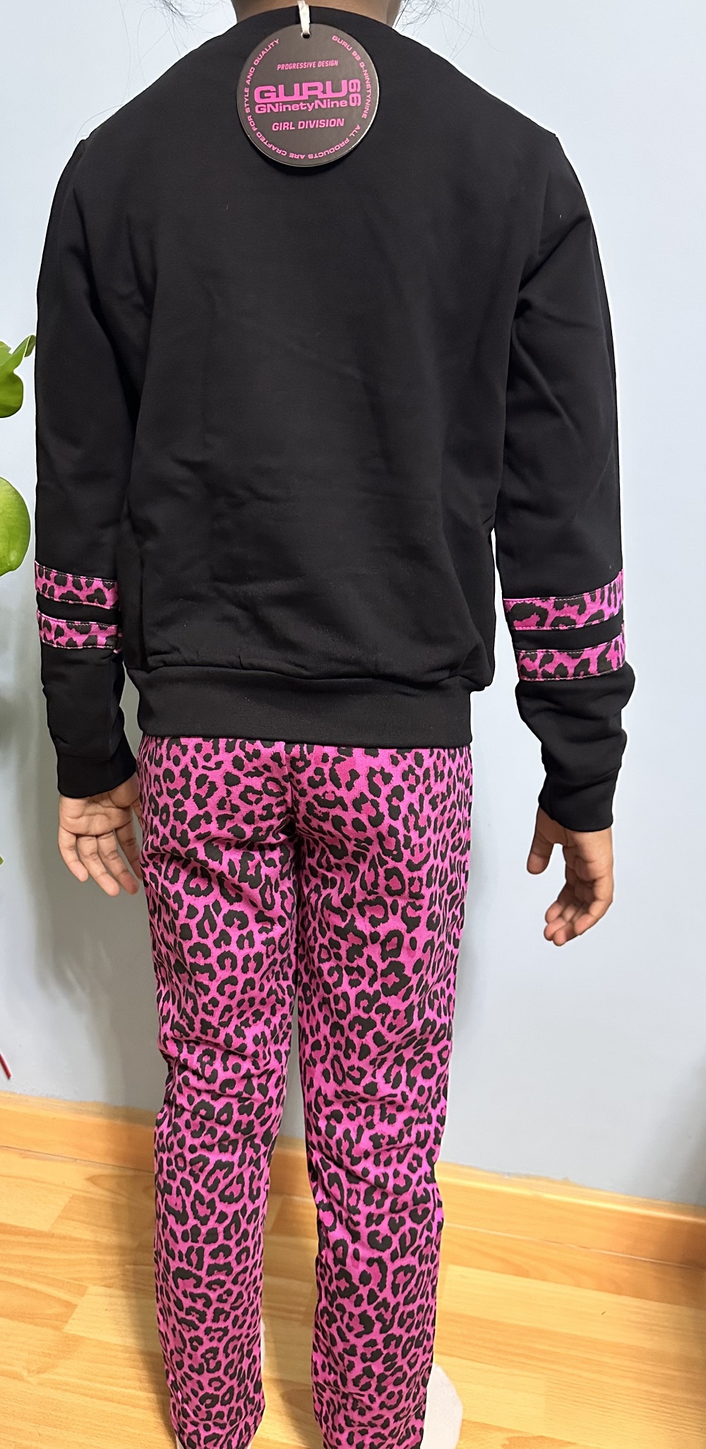 Trendy kids’ outfit featuring a black “GURU G-NINETYNINE” sweatshirt with pink leopard print accents and matching pants. Bold, fun, and comfy!