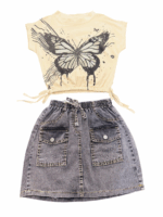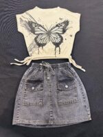 Girls 2-Piece Outfit Set – Butterfly Graphic Crop Top and Denim Skirt | Cute Summer Clothes for Tween & Teen Girls | Casual Stylish Clothing Set
