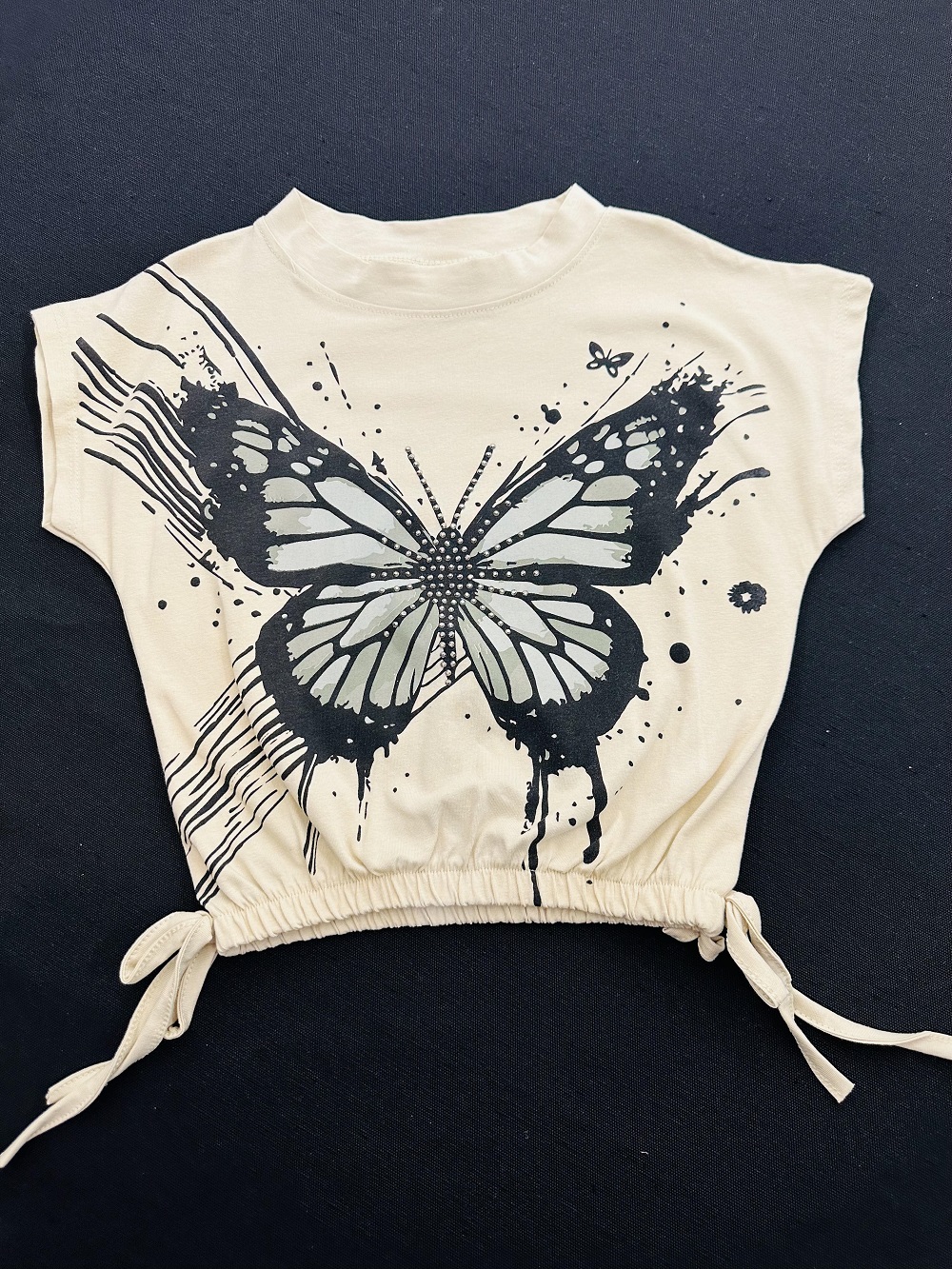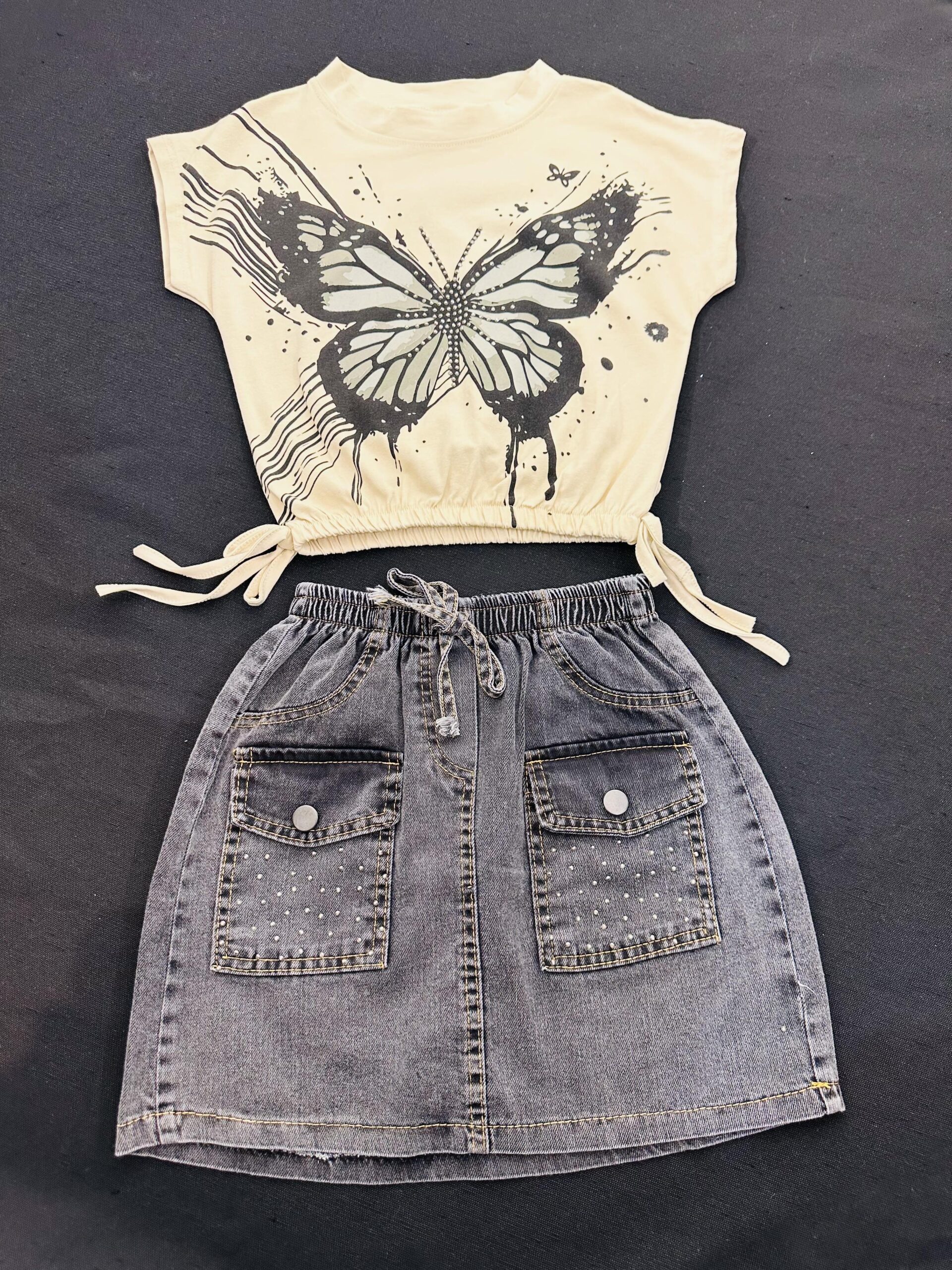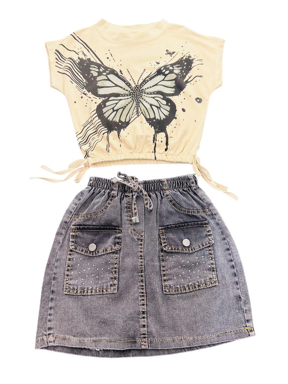 Let your girl shine in this trendy 2-piece set featuring a bold butterfly crop top with adjustable side drawstrings and a high-waisted denim skirt with sparkly rhinestones and utility pockets. Perfect for school, parties, or family outings, this outfit blends comfort, style, and practicality. Made from a soft cotton blend and durable denim, it’s machine washable for easy care.