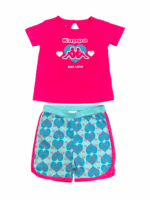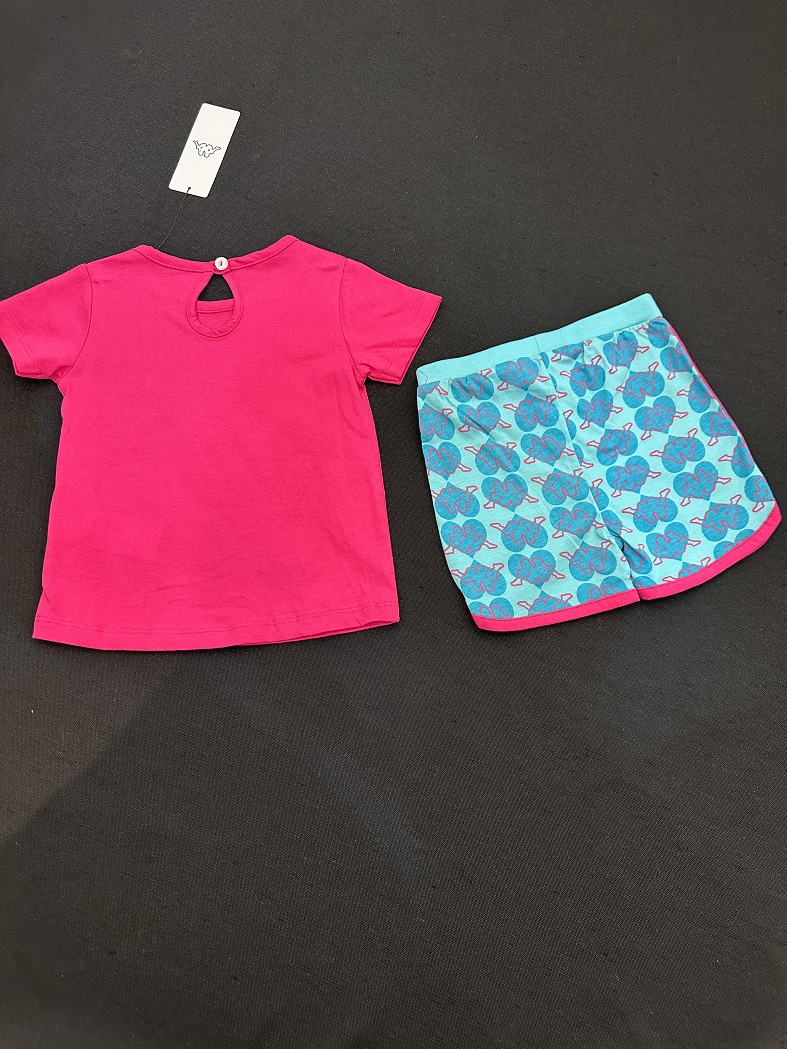 This bright and playful set includes a pink T-shirt with “GIRL LOVE” and heart graphics, paired with light blue printed shorts featuring pink piping and a comfy elastic waistband—perfect for stylish summer fun.