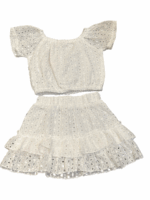 This adorable 2-piece set includes a white eyelet crop top and tiered ruffle skirt, combining style and comfort—perfect for summer days, parties, or playful outings.