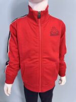 • Stylish and comfortable red full-zip track jacket for kids, featuring sporty sleeve stripes, a high collar, and soft fabric—perfect for everyday wear or active play.